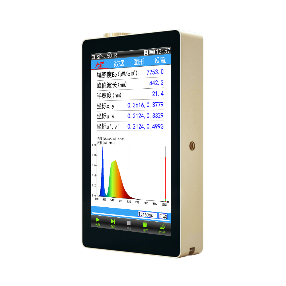 OHSP-350IR集光譜、照度、色溫、顯色指數(shù)、R9、波長、輻照度、色坐標(biāo)、色容差、等測量功能參數(shù)于一體。采用5英寸大屏,各測量參數(shù)及曲線實(shí)時顯示,使用方便快捷。專用于測量紅光及紅外光波段的輻照度和波長的測量,用于紅光治療、紅外夜視監(jiān)控、紅外遙控發(fā)射管、紅外激光等的測量。