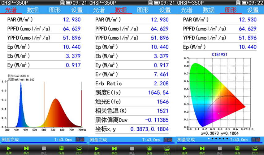 OHSP-350P集PAR 、PPFD、YPFD、葉綠素A、葉綠素B、光譜、波長(zhǎng)、色溫、顯色指數(shù)、照度、輻照度等測(cè)量功能參數(shù)于 一體。采用5英寸大屏 ,各測(cè)量參數(shù)及曲線實(shí)時(shí)顯示 ,使用 方便快捷。 可測(cè)量LED等寬光譜光源、也可以測(cè)量 LED植物生長(zhǎng)燈 ,激光植物生長(zhǎng)燈、太陽(yáng)光、高低 壓鈉燈HID等窄光譜的光源