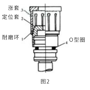 圖2所示工裝由定位套和漲套組成。定位套頭部有5°倒角,用于引導(dǎo)O形圈和耐磨環(huán)裝入活塞端部溝槽。漲套由彈性較好的65 Mn鋼經(jīng)熱處理制成,加工成均勻?qū)ΨQ的8瓣結(jié)構(gòu)。需要注意的是,加工各瓣底部的小孔時,分度要均勻,銑開各瓣時應(yīng)使鋸口對準(zhǔn)小孔的中心,以保證漲套各瓣能均勻漲開。同時各部位都應(yīng)進(jìn)行(光滑)倒角,以免損壞密封圈。
